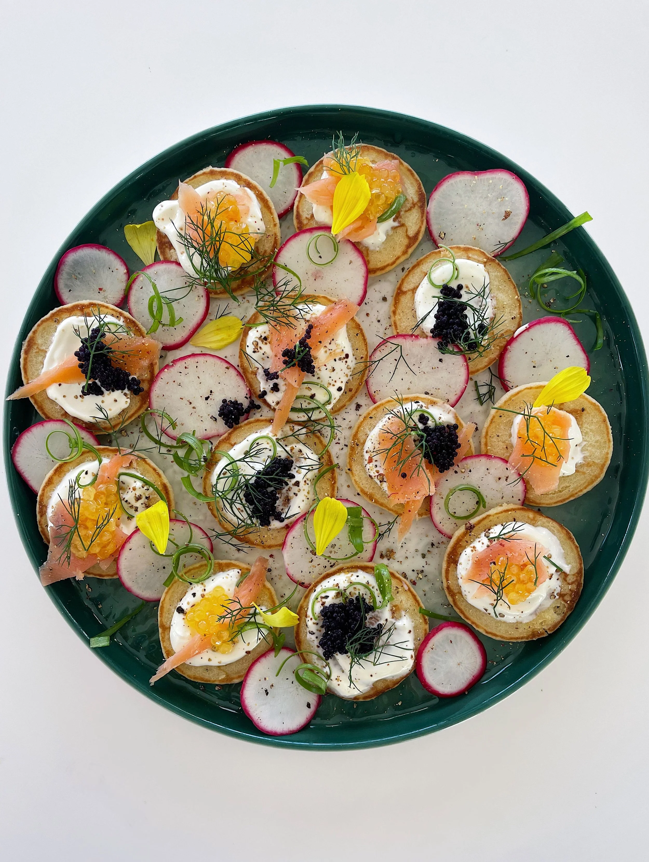 Canapes BEER-BATTERED SAGE CRISPS Delicate fried sage leaves served alongside a curated selection of Mediterranean cured meats and artisan cheeses. MISO-GLAZED EGGPLANT TARTE TATIN Caramelized baby eggplant layered on crisp puff pastry with sweet miso glaze, sesame crème, and micro shiso. CRISP LOBSTER BITES Golden-fried lobster morsels with horseradish aioli and a crown of caviar. CEVICHE NACHOS Citrus-cured market seafood on crisp tortilla shards, avocado purée, charred corn relish, pickled red onion, micro cilantro, and aji Amarillo drizzle. BLINI & CAVIAR PLATTER Warm buckwheat blinis with premium caviar, crème fraîche, chive, and lemon. RICOTTA SOURDOUGH TOAST Orange blossom whipped ricotta on toasted sourdough with honey-roasted grapes, Piemonte hazelnuts, and thyme. KOREAN BBQ BRISKET BAO BUNS Pillowy mini bao buns filled with sticky gochujang-braised brisket, pickled radish, and black garlic aioli. Appetizers >>